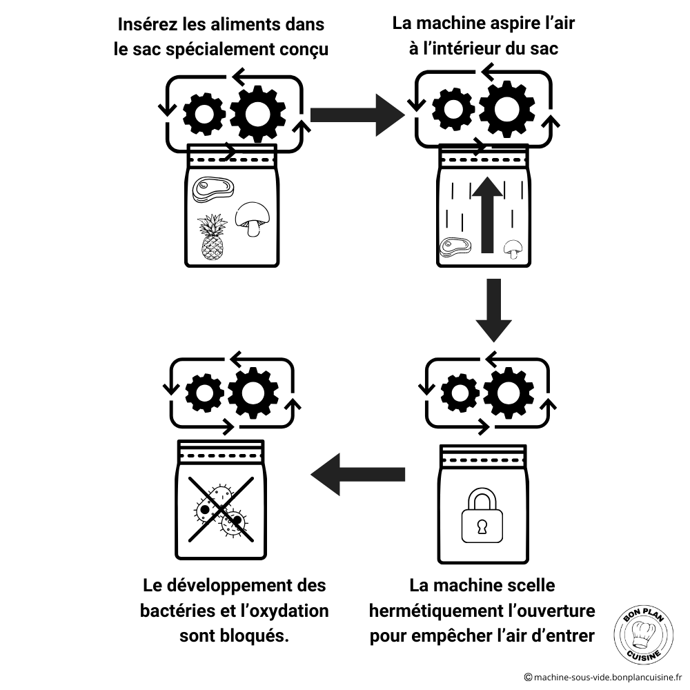 Le fonctionnement d’une machine sous vide repose sur un mécanisme simple. D’abord, vous insérez l’aliment dans un sac spécialement conçu. Ensuite, la machine aspire l’air à l’intérieur du sac, puis scelle hermétiquement l’ouverture pour empêcher toute réintroduction d’oxygène. Ce processus bloque le développement des bactéries et l’oxydation, permettant ainsi de mieux conserver les aliments.